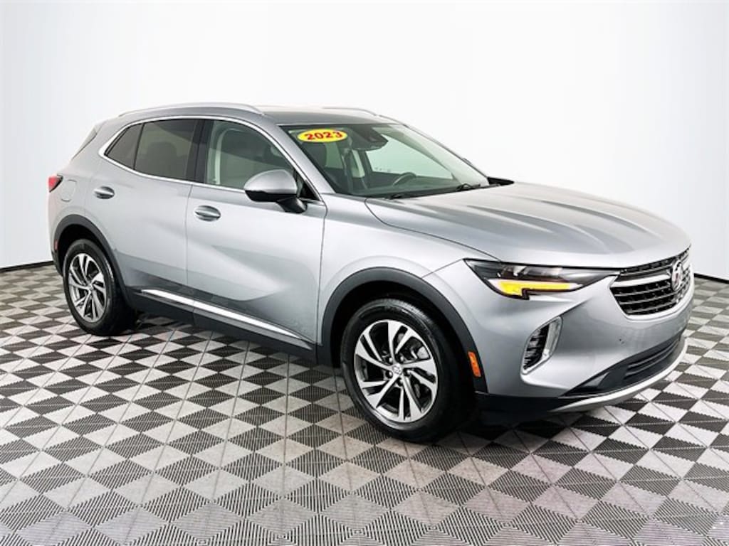 Preferred Equipment Group 1SL, 3.47 Final Drive Axle Ratio, 4-Wheel Disc Brakes, 7 Speakers, 7-Speaker Audio System Feature w/Amplifier, 8-Way Power Driver Seat Adjuster, ABS brakes, Air Conditioning, Alloy wheels, AM/FM radio: SiriusXM, Apple CarPlay/Android Auto, Auto High-beam Headlights, Auto-dimming door mirrors, Auto-dimming Rear-View mirror, Automatic Emergency Braking, Automatic temperature control, Brake assist, Bumpers: body-color, Compass, Delay-off headlights, Driver door bin, Driver vanity mirror, Dual front impact airbags, Dual front side impact airbags, Electronic Stability Control, Emergency communication system: OnStar and Buick connected services capable, Following Distance Indicator, Forward Collision Alert, Four wheel independent suspension, Front anti-roll bar, Front Bin Center Console USB Ports, Front Bucket Seats, Front Center Armrest, Front dual zone A/C, Front Passenger 8-Way Power Seat Adjuster, Front Pedestrian Braking, Front reading lights, Fully automatic headlights, Heated door mirrors, Heated Driver & Front Passenger Seats, Heated front seats, Heated steering wheel, Illuminated entry, IntelliBeam Headlamp Control w/Auto High Beam, Knee airbag, Lane Keep Assist w/Lane Departure Warning, Low tire pressure warning, Memory seat, Not Equipped w/Lane Change & Rear Cross Traffic Alerts, Not Equipped w/Rear Park Assist, Occupant sensing airbag, Outside temperature display, Overhead airbag, Overhead console, Panic alarm, Passenger door bin, Passenger vanity mirror, Perforated Leather-Appointed Seat Trim, Power door mirrors, Power driver seat, Power Liftgate, Power passenger seat, Power steering, Power windows, Premium audio system: Buick Infotainment System, Radio data system, Radio: Buick Infotainment System AM/FM Stereo, Rear anti-roll bar, Rear reading lights, Rear seat center armrest, Rear window defroster, Rear window wiper, Remote keyless entry, Security system, SiriusXM Radio, Speed control, Split folding rear seat, Spoiler, Steering wheel mounted audio controls, Telescoping steering wheel, Tilt steering wheel, Traction control, Trip computer, USB Charging-Only Ports, Variably intermittent wipers, Wheels: 18 Machined Aluminum w/Light Silver Met, and Wireless Apple CarPlay/Wireless Android Auto. Clean CARFAX. CARFAX One-Owner. Moonstone Gray Metallic Buick 2023 Envision Essence