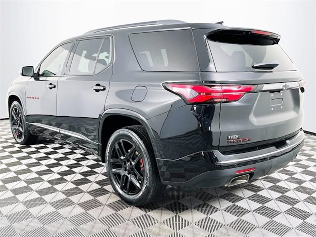 Floor Liner Package (LPO) (1st & 2nd Row All-Weather Floor Liner (LPO), 3rd Row All-Weather Floor Liner (LPO), and Integrated Cargo Liner (LPO)), Preferred Equipment Group 1LZ (Heated 2nd Row Outboard Position Seats, Heated Driver & Front Passenger Seats, Heated Steering Wheel, Rear Park Assist w/Audible Warning, and Ventilated Driver & Front Passenger Seats), Redline Edition (Black Door Handles, Black Roof Rails, Dual SkyScape 2-Panel Power Sunroof, Ornamentation, Redline Accent Decals (LPO), and Wheels: 20 Gloss Black Painted Alum w/Red Stripes), Trailering Equipment (Heavy-Duty Cooling System, Hitch Guidance w/Hitch View, and Trailering Assist Guidelines), 10 Speakers, 3.49 Axle Ratio, 3rd row seats: split-bench, 4-Wheel Disc Brakes, 6-Way Power Front Passenger Seat, 8-Way Power Driver Seat Adjuster, ABS brakes, Air Conditioning, Alloy wheels, AM/FM radio: SiriusXM with 360L, Apple CarPlay/Android Auto, Auto High-beam Headlights, Auto-dimming door mirrors, Auto-dimming Rear-View mirror, Automatic temperature control, Black Lug Nut & Wheel Lock Kit (LPO), Bose Premium 10-Speaker Audio System Feature, Brake assist, Bumpers: body-color, Compass, Delay-off headlights, Driver door bin, Driver vanity mirror, Dual front impact airbags, Dual front side impact airbags, Electronic Stability Control, Emergency communication system: OnStar Guidance, Four wheel independent suspension, Front anti-roll bar, Front Bucket Seats, Front Center Armrest, Front dual zone A/C, Front Passenger 2-Way Power Lumbar, Front reading lights, Fully automatic headlights, Garage door transmitter, Heated door mirrors, Heated front seats, Heated rear seats, Heated steering wheel, Illuminated entry, Leather steering wheel, Low tire pressure warning, Memory seat, Navigation System, Not Equipped w/Dr & Fr Pass Heated or Ventilated Seats, Not Equipped w/Heated Rear Outboard Seats (DISC), Not Equipped w/Heated Steering Wheel, Not Equipped w/Rear Park Assist, Occupant sensing airbag, Outside temperature display, Overhead airbag, Overhead console, Panic alarm, Passenger door bin, Passenger vanity mirror, Perforated Leather-Appointed Seat Trim, Power door mirrors, Power Driver Lumbar Control, Power driver seat, Power Liftgate, Power passenger seat, Power steering, Power windows, Premium audio system: Chevrolet Infotainment 3 Plus, Radio data system, Radio: Chevrolet Infotainment 3 Plus System w/Navi, Rear air conditioning, Rear anti-roll bar, Rear reading lights, Rear window defroster, Rear window wiper, Remote keyless entry, Roof rack: rails only, Security system, SiriusXM w/360L, Speed control, Speed-sensing steering, Spoiler, Steering wheel memory, Steering wheel mounted audio controls, Tachometer, Telescoping steering wheel, Tilt steering wheel, Traction control, Trip computer, Turn signal indicator mirrors, Variably intermittent wipers, Ventilated front seats, Voltmeter, and Wheels: 20 Metallic Machined-Face Aluminum. Clean CARFAX. CARFAX One-Owner. Mosaic Black Metallic Chevrolet 2022 Traverse Premier