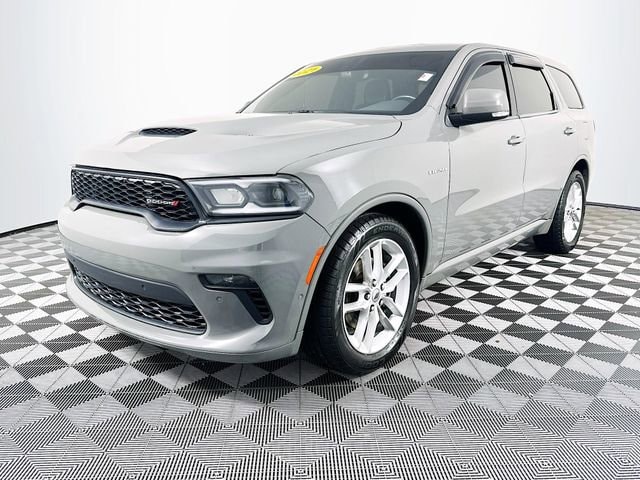 Quick Order Package 22S, AWD, 10.1 Touchscreen Display, 3.09 Rear Axle Ratio, 3rd row seats: split-bench, 4-Wheel Disc Brakes, 4G LTE Wi-Fi Hot Spot, 9 Speakers, ABS brakes, Air Conditioning, Alloy wheels, AM/FM radio: SiriusXM w/360L, Anti-whiplash front head restraints, Apple CarPlay, Apple CarPlay/Android Auto, Audio memory, Auto High-beam Headlights, Auto-dimming door mirrors, Auto-dimming Rear-View mirror, Auto-leveling suspension, Automatic temperature control, Brake assist, Bumpers: body-color, Compass, Connected Travel & Traffic Services, Delay-off headlights, Disassociated Touchscreen Display, Driver door bin, Driver vanity mirror, Dual front impact airbags, Dual front side impact airbags, Electronic Stability Control, Emergency communication system: SiriusXM Guardian, Four wheel independent suspension, Front anti-roll bar, Front Bucket Seats, Front Center Armrest w/Storage, Front dual zone A/C, Front fog lights, Front reading lights, Fully automatic headlights, Garage door transmitter, Global Telematics Box Module (TBM), Google Android Auto, GPS Antenna Input, GPS Navigation, HD Radio, Heated door mirrors, Heated front seats, Heated rear seats, Heated steering wheel, Heavy-Duty Engine Cooling, Hemi Badge, Illuminated entry, Integrated Center Stack Radio, Integrated Voice Command w/Bluetooth, Knee airbag, Leather steering wheel, Leather Suede Bucket Seats, Low tire pressure warning, Memory seat, Navigation system: TomTom, Occupant sensing airbag, Outside temperature display, Overhead airbag, Overhead console, Panic alarm, ParkView Rear Back-Up Camera, Passenger door bin, Passenger vanity mirror, Power door mirrors, Power driver seat, Power Liftgate, Power passenger seat, Power steering, Power Sunroof, Power windows, Radio data system, Radio: Uconnect 5 Nav w/10.1 Display, Rain sensing wipers, Rear air conditioning, Rear anti-roll bar, Rear Load Leveling Suspension, Rear reading lights, Rear seat center armrest, Rear window defroster, Rear window wiper, Remote keyless entry, Security system, SiriusXM Guardian - Included Trial (B), SiriusXM Satellite Radio, SiriusXM w/360L, Speed control, Speed-sensing steering, Speed-Sensitive Wipers, Split folding rear seat, Spoiler, Steering wheel mounted audio controls, Tachometer, Telescoping steering wheel, Tilt steering wheel, Traction control, Trip computer, Turn signal indicator mirrors, USB Host Flip, Variably intermittent wipers, Voltmeter, and Wheels: 20 x 8.0 Fine Silver. Destroyer Gray Clearcoat Dodge 2021 Durango R/T