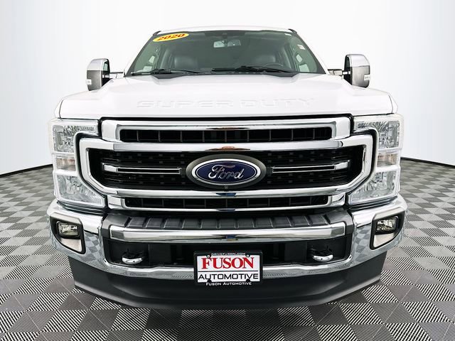 5th Wheel/Gooseneck Hitch Prep Package, Chrome Package (6 Angular Chrome Step Bars, Body-Color Door Handles w/Chrome Insert, Chrome Exhaust Tip, PowerScope Trailer Tow Mirrors w/Heat, Unique Chrome Mirror Caps, and Wheels: 18 Chrome PVD Aluminum), FX4 Off-Road Package (Hill Descent Control, Off-Road Specifically Tuned Shock Absorbers, and Unique FX4 Off-Road Box Decal), GVWR: 10,000 lb Payload Package, High Capacity Trailer Tow Package, Lariat Ultimate Package (Ambient Lighting - Fixed Color, Easy Entry®/Exit Memory Driver's Seat Feature, Intelligent Access w/Push-Button Start, LED Box Lighting, Memory Power-Adjustable Pedals, Power Heated/Ventilated Driver Seat w/Memory, Power Heated/Ventilated Passenger Seat, Power Telescoping/Tilt Steering Wheel/Column, PowerScope Trailer Tow Mirrors w/Memory, Remote Start System, Remote Tailgate Release, Tailgate Step & Handle, and Voice-Activated Touchscreen Navigation System), Order Code 608A, Pro Trailer Backup Assist - High Capacity (Ultimate Trailer Tow Camera System), Snow Plow Prep Package, 4WD, 10 Speakers, 110V/400W Outlet, 332 Amp Alternators, 4-Wheel Disc Brakes, 6 Angular Chrome Step Bar, ABS brakes, Adjustable pedals, Air Conditioning, Alloy wheels, AM/FM radio: SiriusXM, Auto High-beam Headlights, Auto-dimming Rear-View mirror, Automatic temperature control, Brake assist, Bumpers: chrome, Compass, Delay-off headlights, Driver door bin, Driver vanity mirror, Dual front impact airbags, Dual front side impact airbags, Electronic Stability Control, Emergency communication system: SYNC 3 911 Assist, Exterior Parking Camera Rear, Flow-Through Console, Front & Rear Wheel Well Liners (Pre-Installed), Front anti-roll bar, Front Bucket Seats, Front Center Armrest, Front dual zone A/C, Front fog lights, Front Leather Seating Surfaces 40/Console/40, Front reading lights, Fully automatic headlights, Heated door mirrors, Illuminated entry, Leather steering wheel, Low tire pressure warning, Outside temperature display, Overhead airbag, Overhead console, Panic alarm, Passenger door bin, Passenger vanity mirror, Power door mirrors, Power driver seat, Power passenger seat, Power steering, Power windows, Radio data system, Radio: B&O System by Bang & Olufsen, Rear Parking Sensors, Rear reading lights, Rear seat center armrest, Rear step bumper, Rear window defroster, Remote keyless entry, Security system, SiriusXM Radio, Speed control, Split folding rear seat, Steering wheel mounted audio controls, SYNC 3 Communications & Entertainment System, Tachometer, Telescoping steering wheel, Tilt steering wheel, Tough Bed Spray-In Bedliner, Traction control, Trip computer, Turn signal indicator mirrors, Twin Panel Power Moonroof, Universal Garage Door Opener (UGDO), Upfitter Switches (6), Variably intermittent wipers, and Wheels: 18 Bright Machined Cast Aluminum. CARFAX One-Owner. Oxford White Ford 2020 F-250SD Lariat