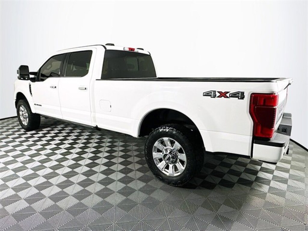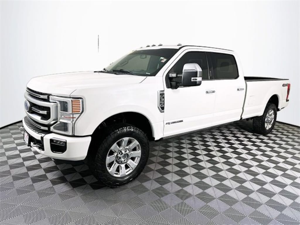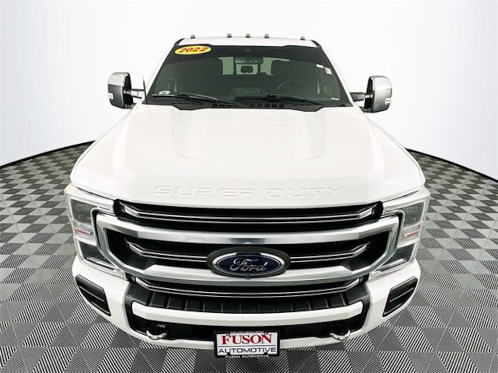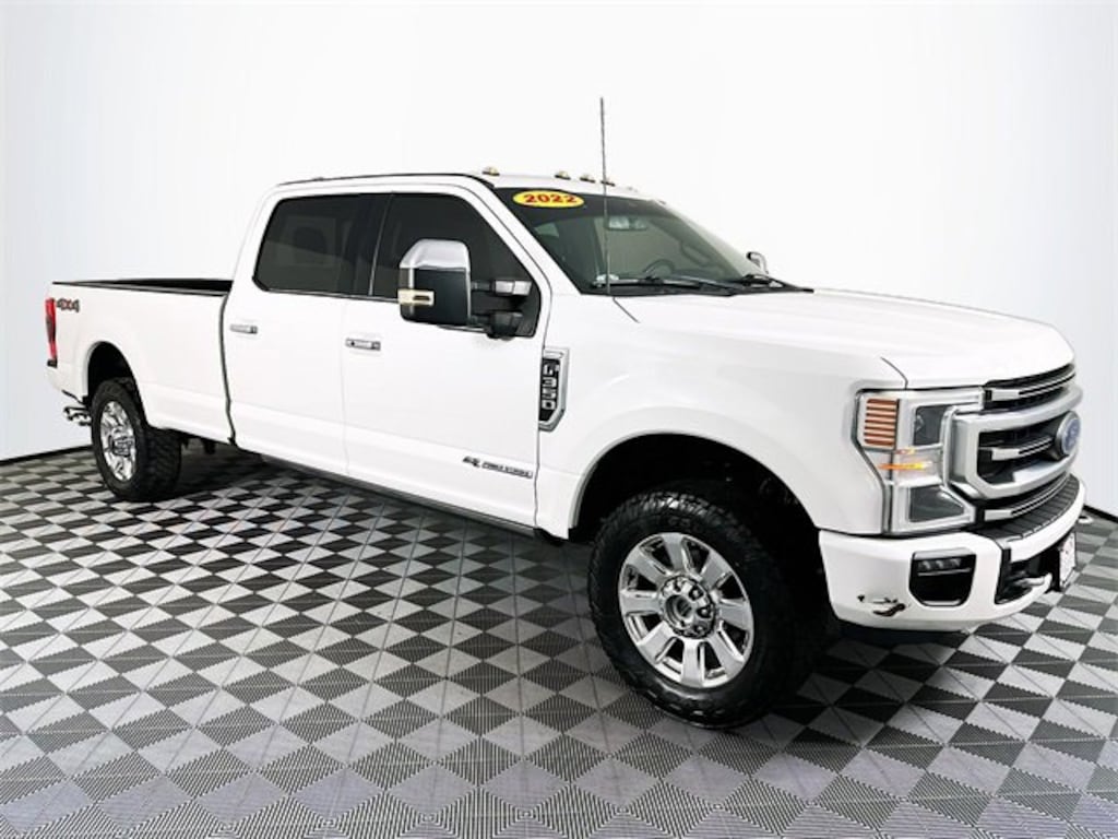 4WD, 10 Speakers, 4-Wheel Disc Brakes, ABS brakes, Adjustable pedals, Air Conditioning, Alloy wheels, AM/FM radio: SiriusXM with 360L, Auto High-beam Headlights, Auto-dimming Rear-View mirror, Automatic temperature control, Brake assist, Compass, Delay-off headlights, Driver door bin, Driver vanity mirror, Dual front impact airbags, Dual front side impact airbags, Electronic Stability Control, Emergency communication system: SYNC 4 911 Assist, Engine Block Heater, Exterior Parking Camera Rear, Flow-Through Console, Front anti-roll bar, Front Bucket Seats, Front Center Armrest, Front dual zone A/C, Front fog lights, Front reading lights, Fully automatic headlights, Heated door mirrors, Illuminated entry, Leather steering wheel, LED Roof Clearance Lights, Low tire pressure warning, Navigation system: Connected Navigation, Outside temperature display, Overhead airbag, Overhead console, Panic alarm, Passenger door bin, Passenger vanity mirror, Power door mirrors, Power driver seat, Power passenger seat, Power steering, Power windows, Radio data system, Radio: B&O Sound System by Bang & Olufsen, Rear Parking Sensors, Rear reading lights, Rear seat center armrest, Rear step bumper, Rear window defroster, Remote keyless entry, Security system, SiriusXM Radio w/360L, Speed control, Split folding rear seat, Steering wheel mounted audio controls, SYNC 4 w/Enhanced Voice Recognition, Tachometer, Telescoping steering wheel, Tilt steering wheel, Traction control, Trip computer, Turn signal indicator mirrors, Twin Panel Power Moonroof, Upfitter Switches (6), and Variably intermittent wipers. CARFAX One-Owner. Star White Metallic Tri-Coat Ford 2022 F-350SD Platinum