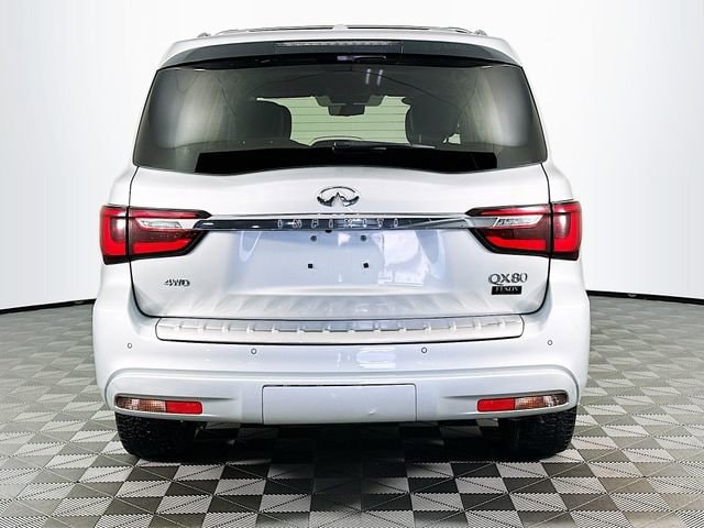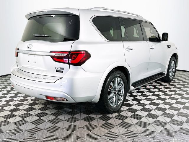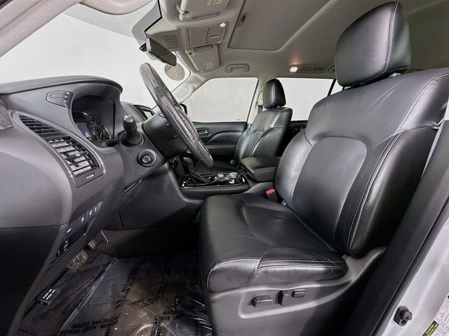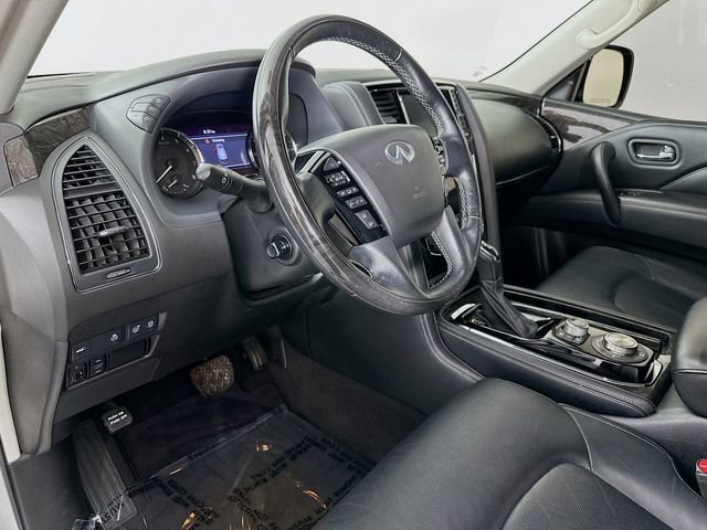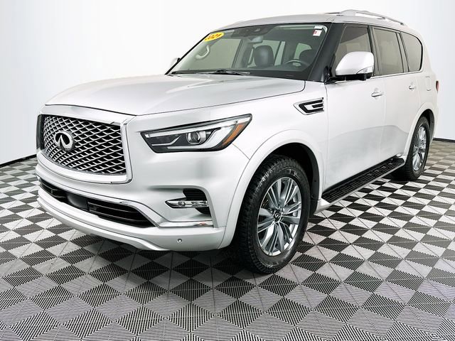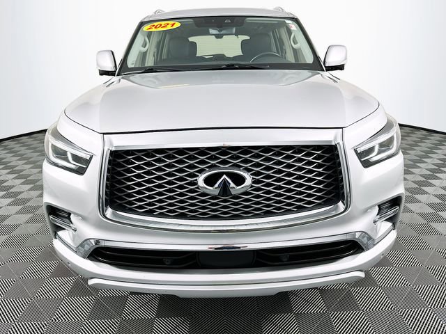 13 Speakers, 2.937 Axle Ratio, 3rd row seats: split-bench, 4-Wheel Disc Brakes, ABS brakes, Air Conditioning, Alloy wheels, AM/FM radio: SiriusXM, Anti-whiplash front head restraints, Apple CarPlay/Android Auto, Auto High-beam Headlights, Auto tilt-away steering wheel, Auto-dimming door mirrors, Auto-dimming Rear-View mirror, Auto-leveling suspension, Automatic temperature control, Brake assist, Bumpers: body-color, CD player, Compass, Delay-off headlights, Driver door bin, Driver vanity mirror, Dual front impact airbags, Dual front side impact airbags, DVD-Audio, Electronic Stability Control, Emergency communication system: INFINITI Connection, Four wheel independent suspension, Front anti-roll bar, Front Bucket Seats, Front Center Armrest, Front dual zone A/C, Front fog lights, Front reading lights, Fully automatic headlights, Garage door transmitter: HomeLink, Heated door mirrors, Heated Front Bucket Seats, Heated front seats, Heated steering wheel, Illuminated entry, Leather Shift Knob, Leather steering wheel, Leather-Appointed Seats, Literature Kit, Low tire pressure warning, Memory seat, Navigation system: INFINITI InTouch Navigation, Occupant sensing airbag, Outside temperature display, Overhead airbag, Overhead console, Panic alarm, Passenger door bin, Passenger vanity mirror, Power door mirrors, Power driver seat, Power Liftgate, Power moonroof, Power passenger seat, Power steering, Power windows, Radio data system, Radio: Bose Audio System w/13 Speakers, Rain sensing wipers, Rear air conditioning, Rear anti-roll bar, Rear audio controls, Rear reading lights, Rear seat center armrest, Rear window defroster, Rear window wiper, Reclining 3rd row seat, Remote keyless entry, Security system, Speed control, Speed-sensing steering, Split folding rear seat, Spoiler, Steering wheel memory, Steering wheel mounted audio controls, Tachometer, Telescoping steering wheel, Tilt steering wheel, Traction control, Trip computer, Turn signal indicator mirrors, Variably intermittent wipers, Voltmeter, and Wheels: 20 x 8.0 Aluminum-Alloy. Liquid Platinum INFINITI 2021 QX80 LUXE