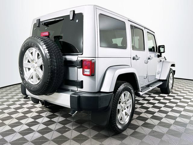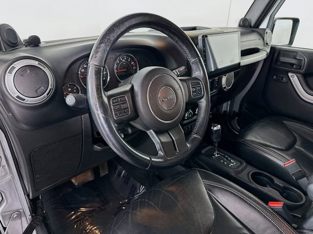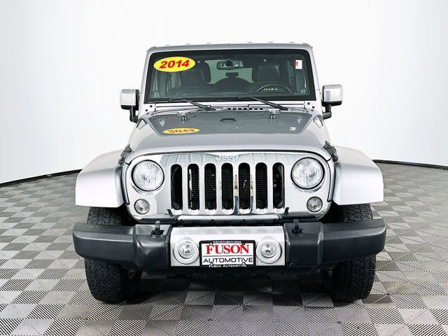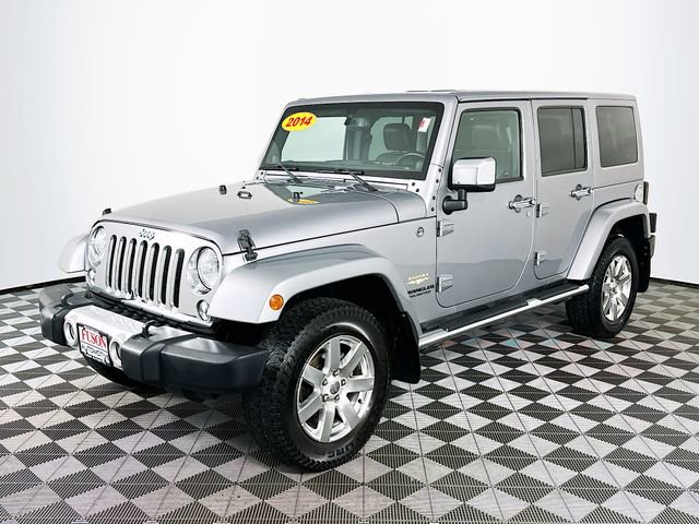 Connectivity Group (Tire Pressure Monitoring Display and Vehicle Information Center), Dual Top Group (Premium Black Sunrider Soft Top), Mopar Chrome Edition Group (Chrome Fuel Filler Door, Mopar Chrome Exhaust Tip, MOPAR Chrome Taillamp Guards, and Mopar Chrome Tubular Side Steps), Mopar Premium Chrome Group (Bright Grille and Chrome Exterior Mirrors), Quick Order Package 24G, 1-Year SIRIUSXM Travel Link Service, 18 x 7.5 7-Spoke Polished Aluminum Wheels, 18 x 7.5 Polished Satin Carbon Wheels, 3.21 Rear Axle Ratio, 4-Wheel Disc Brakes, 40GB Hard Drive w/28GB Available, 6.5 Touch Screen Display, 7 Speakers, ABS brakes, Air Conditioning, Air Conditioning w/Auto Temperature Control, Air Filtering, Alloy wheels, AM/FM radio, Audio Jack Input for Mobile Devices, Auto-dimming Rear-View mirror, Brake assist, CD player, Cloth Bucket Seats, Compass, Delete Sunrider Soft Top, Driver door bin, Driver vanity mirror, Dual front impact airbags, Electronic Stability Control, Freedom Panel Storage Bag, Front anti-roll bar, Front Bucket Seats, Front Center Armrest w/Storage, Front fog lights, Front reading lights, Fully automatic headlights, GPS Navigation, Heated door mirrors, Heated Front Seats, Heavy Duty Suspension w/Gas Shocks, Illuminated entry, Integrated roll-over protection, Leather steering wheel, Low tire pressure warning, Occupant sensing airbag, Outside temperature display, Panic alarm, Passenger door bin, Passenger vanity mirror, Power door mirrors, Power steering, Power windows, Radio data system, Radio: Uconnect 130 AM/FM/CD/MP3, Radio: Uconnect 430N CD/DVD/MP3/HDD/NAV, Rear anti-roll bar, Rear Window Defroster, Rear Window Wiper/Washer, Remote keyless entry, Remote Start System, Remote USB Port, Security system, SIRIUSXM Travel Link, Speed control, Split folding rear seat, Steering wheel mounted audio controls, Tachometer, Tilt steering wheel, Traction control, Trip computer, and Variably intermittent wipers. Billet Metallic Clearcoat Jeep 2014 Wrangler Unlimited Sahara