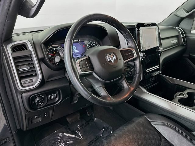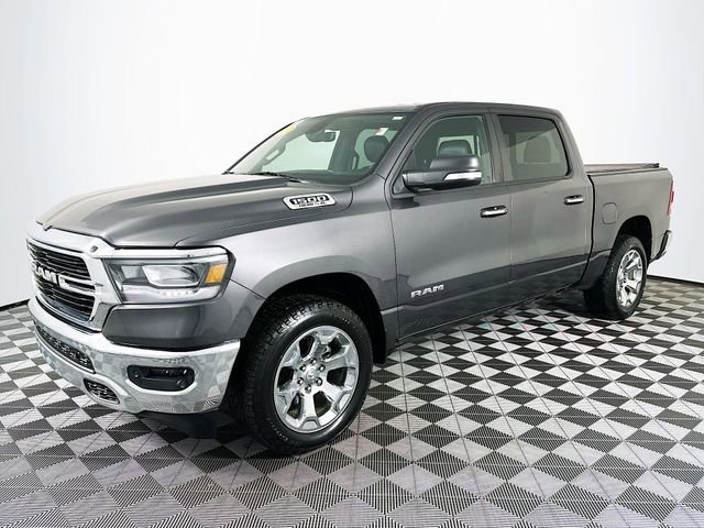 Big Horn Level 2 Equipment Group (ParkSense Front/Rear Park Assist w/Stop, Remote Start System, and Single Disc Remote CD Player), Premium Lighting Group (Front LED Fog Lamps, LED Reflector Headlamps, and LED Taillamps), Quick Order Package 25Z Big Horn/Lone Star, 3 Rear Seat Head Restraints, 3.21 Rear Axle Ratio, 4 Way Front Headrests, 4-Wheel Disc Brakes, 48V Belt Starter Generator, 6 Speakers, 9 Amplified Speakers w/Subwoofer, ABS brakes, Air Conditioning, Alloy wheels, AM/FM radio, Blind Spot & Cross Path Detection, Brake assist, Bumpers: chrome, Cloth Bench Seat, Compass, Delay-off headlights, Driver door bin, Dual front impact airbags, Dual front side impact airbags, Electronic Stability Control, Front anti-roll bar, Front Center Armrest w/Storage, Front fog lights, Front reading lights, Front Seat Back Map Pockets, Front wheel independent suspension, Fully automatic headlights, GPS Antenna Input, Heated door mirrors, Illuminated entry, Leather steering wheel, Low tire pressure warning, Manufacturer's Statement of Origin, Occupant sensing airbag, Outside temperature display, Overhead airbag, Overhead console, Panic alarm, ParkView Rear Back-Up Camera, Passenger door bin, Passenger vanity mirror, Power door mirrors, Power steering, Power windows, Radio data system, Radio: Uconnect 12 w/Navigation, Radio: Uconnect 3 w/5 Display, Rear 60/40 Folding Seat, Rear anti-roll bar, Rear seat center armrest, Rear step bumper, Rear Wheelhouse Liners, Remote keyless entry, Speed control, Split folding rear seat, Tachometer, Telescoping steering wheel, Tilt steering wheel, Traction control, Trip computer, Variably intermittent wipers, Voltmeter, Wheels: 18 x 8, and Wheels: 20 x 9 Aluminum Chrome Clad. Clean CARFAX. Granite Crystal Metallic Clearcoat Ram 2019 1500 Big Horn/Lone Star